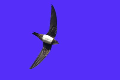 Només a l’extrem sud de la península. Negre com el falciot negre però amb una gran taca blanca al carpó.