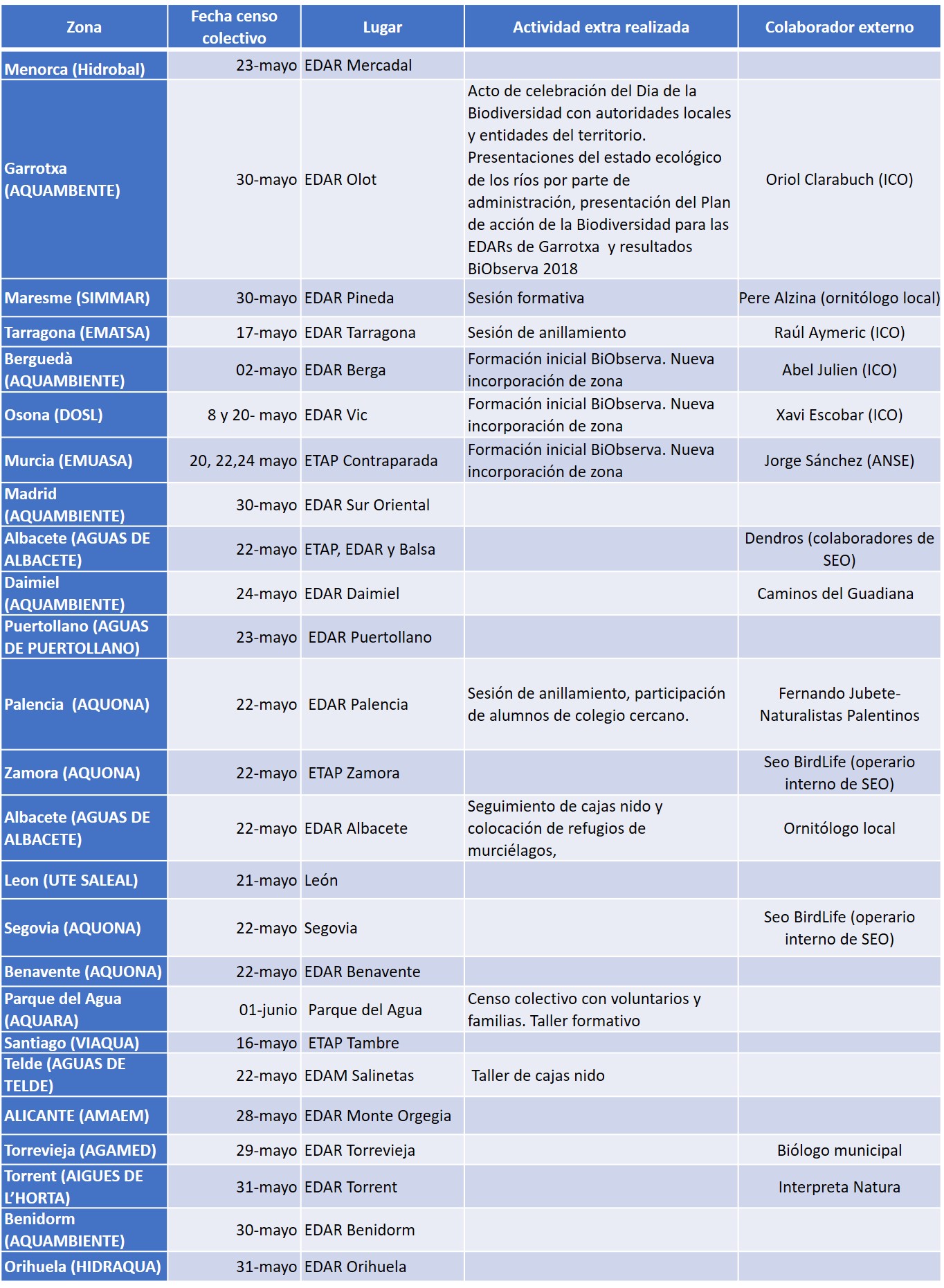 A més, les empreses del grup han organitzat diversos actes a les seves instal·lacions, com un cens primaveral conjunt d’aus en el qual han participat entitats naturalistes locals; també s’han penjat les caixes niu lliurades a les diferents instal·lacions participants, i s’han entregat reconeixements als voluntaris més actius de cada zona. El programa de voluntariat ambiental BiObserva implica el personal de les instal·lacions en la conservació de la biodiversitat local, començant per l’entorn natural dels centres que gestiona SUEZ Spain.